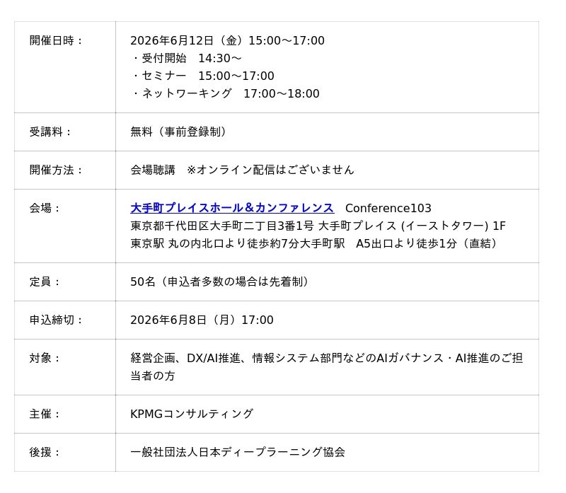 <申込URL>https://kpmg.com/jp/ja/events/2026/04/20260612-ai-guideline.html※希望者多数の場合は先着制とさせていただきます。