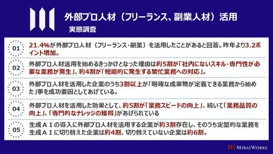 株式会社みらいワークス(本社:東京都港区、代表取締役社長 岡本祥治、以下「当社」)は、2月6日のプロフェッショナルの日(※1)を記念して、大企業1,000名への『外部プロ人材(フリーランス・副業)活用実態』調査を実施しましたので、お知らせいたします。