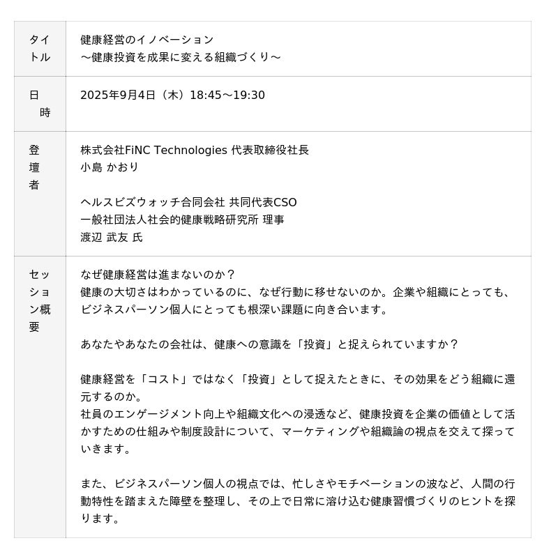 また、会期中の9月4日(木)には、当社代表取締役社長の小島 かおりが「健康経営のイノベーション」をテーマに登壇いたします。