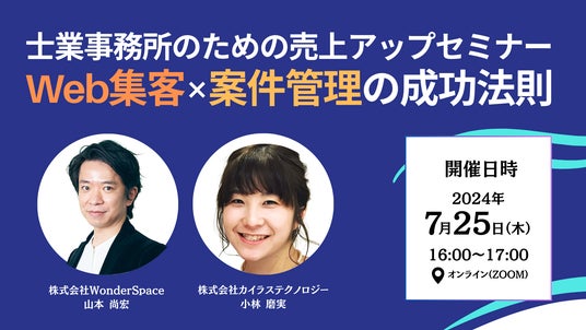 株式会社WonderSpace(本社:東京都港区、代表取締役社長:山本 尚宏)は、株式会社カイラステクノロジー(本社:東京都港区、代表取締役:富士 慶)と「士業事務所のための売上アップセミナー Web集客×案件管理の成功法則」共催ウェビナーを開催いたします。