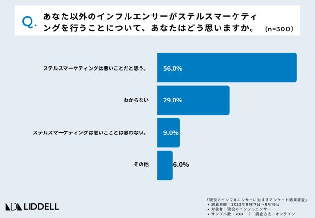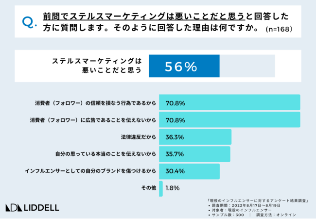 また、「ステルスマーケティングは悪いことだと思う」と回答した率は56%と約半数で「分からない」が29%でした。悪いことだと思う理由として「(消費者)フォロワーに広告であることを伝えないから」「(消費者)フォロワーの信頼を損なう行為であるから」が70.8%と高く、多くのインフルエンサーはフォロワーとの信頼関係が大切と考えていることが明らかになりました。