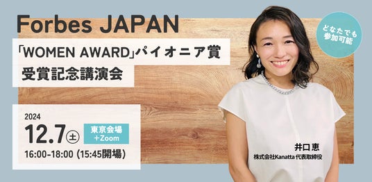 株式会社Kanatta(本社:東京都渋谷区、代表取締役社長:井口 恵)は、この度、代表の井口 恵が「Forbes JAPAN WOMEN AWARD 2024」において「パイオニア賞」を受賞したことを記念し、特別講演会を開催いたします。