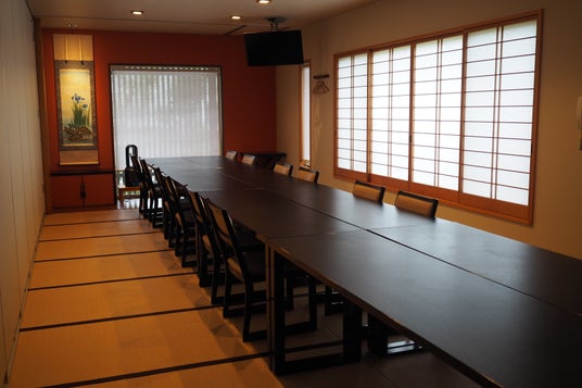 客間は2つあり、間の壁を取り払うことで最大48名のお客さんを受け入れることができます。客間用の掛け軸は、季節に合わせて使用できるように合計13本が用意されて、会食のシーンに合わせて入れ替えることで、お客様に多様なシーンでの利用を訴求しています。