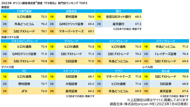 実際のサービス利用者を対象に第三者の立場で顧客満足度調査を実施する株式会社oricon ME(よみ:オリコン エムイー 本社:東京都港区 代表取締役社長:小池恒 略称:オリコン)は、『FX取引』についての満足度調査を実施し、2023年1月4日(水)14時にその結果を発表いたしました。結果は、以下の通りとなっております。