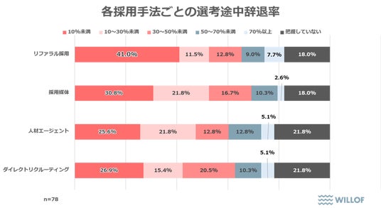 選考途中辞退率についても、辞退率10%未満の割合が「リファラル採用(41.0%)」で最も高く、「採用媒体(30.7%)」、「人材エージェント(25.6%)」、「ダイレクトリクルーティング(26.9%)」と比較しても、候補者の選考への意欲が高いことが分かりました。