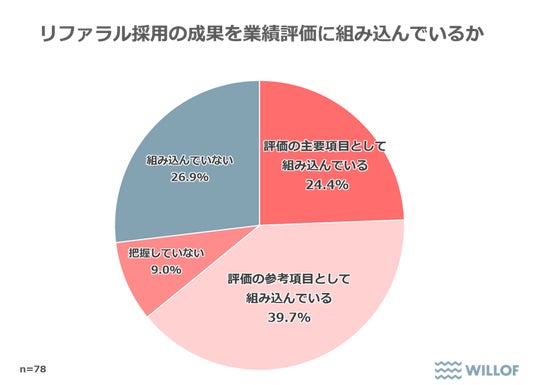 【リファラル採用の成果を人事部門や採用担当者の業績評価に組み込んでいるか】について聞いたところ、「評価の主要項目として組み込んでいる(24.4%)」、「評価の参考項目として組み込んでいる(39.7%)」を合わせると64.1%の企業が何らかの形で評価に組み込んでいることが分かりました。