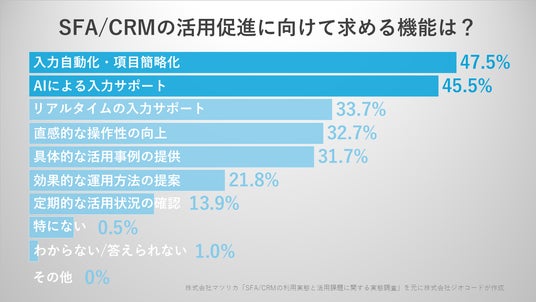 BtoB企業・BtoBtoC企業の営業部門管理職及び主任等の営業担当者101名を対象に行われた「SFA/CRMの利用実態と活用課題に関する実態調査(※)」によると、SFA/CRMの活用促進に向けて求められる機能として「入力自動化・項目簡略化(47.5%)」「AIによる入力サポート(45.5%)」の2つが上位に挙がっています。