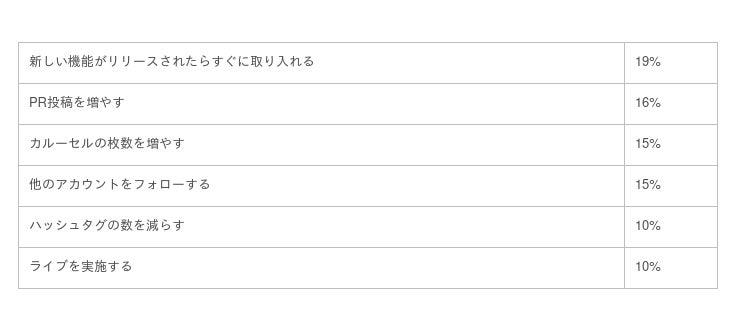インスタグラムでフォロワーを増やしているインフルエンサーは、さまざまな機能を駆使してコンテンツを展開するとともに、フォロワーと活発なコミュニケーションを大切にしていることが分かる結果となりました。また、実践しているアクションの上位項目は、インスタグラムアルゴリズムの重要項目「関心度」「親密度」「鮮度」を意識したアクションと言えます。