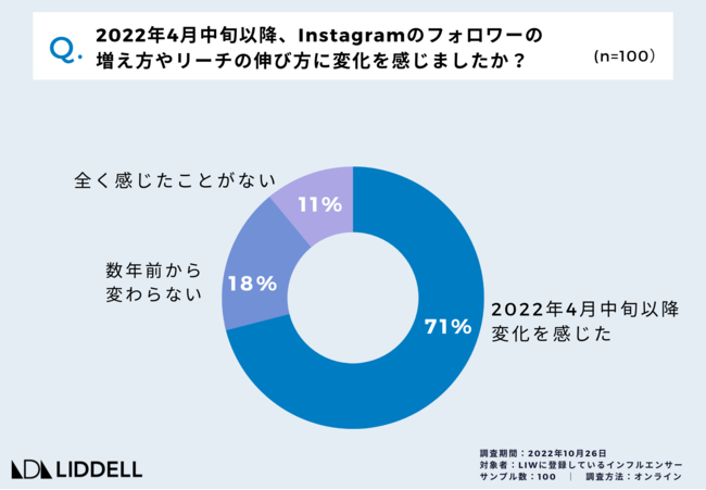 インフルエンサーに「2022年4月以降、Instagramのフォロワーの増え方やリーチの伸び方に変化を感じましたか?」と聞いたところ、71%が変化を感じたと回答。SNSのスペシャリストであるインフルエンサーも変化を実感したことが明らかになりました。