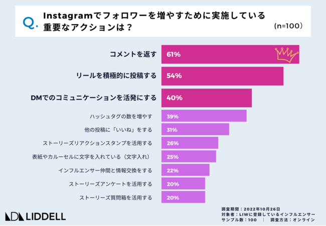多くのインフルエンサーが実践しているアクションランキングのTOP3は「コメントを返す」「リールを積極的に投稿する」「DMでのコミュニケーションを活発にする」
