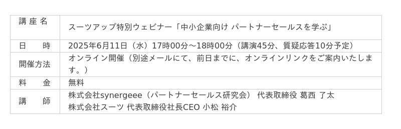 株式会社スーツ(所在地:東京都千代田区、代表取締役社長CEO:小松 裕介)は、2025年6月11日(水)17時から、ゲスト講師に、株式会社synergeee(パートナーセールス研究会) 代表取締役 葛西 了太氏を迎え、第10回となるスーツアップ特別ウェビナー「中小企業向け パートナーセールスを学ぶ」を無料開催します。