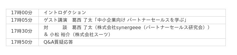 1.スーツアップ特別ウェビナー「中小企業向け パートナーセールスを学ぶ」概要当社では、6月11日(水)17時から、ゲスト講師に、株式会社synergeee(パートナーセールス研究会) 代表取締役 葛西 了太氏を迎え、第10回目となるスーツアップ特別ウェビナー「中小企業向け パートナーセールスを学ぶ」を無料開催します。