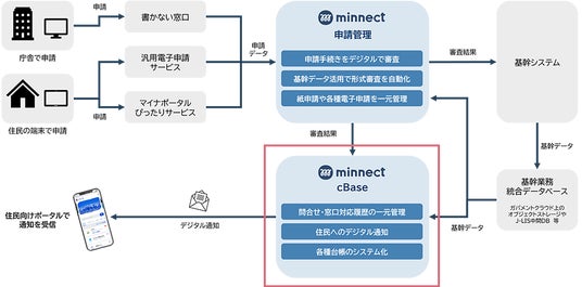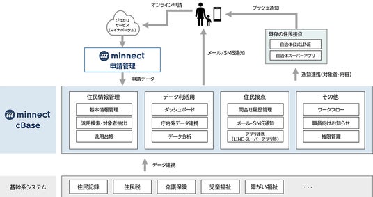 「minnect cBase」は、住民の個別ニーズに応じた行政サービスと住民情報の安心・安全な管理を両立させた自治体向けのCRMシステムです。基幹システムや紙・表計算ソフトで管理されている住民情報や問い合わせ・相談履歴を一元管理し、住民にパーソナライズ化された行政サービスの提供を実現します。