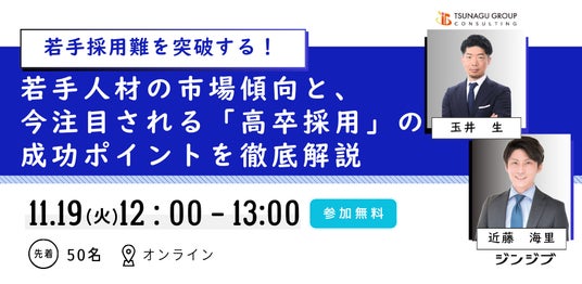 株式会社ツナググループ・ホールディングス(本社:東京都中央区、代表取締役兼執行役員社長:米田 光宏)は、2024年11月19日(火)にオンラインにて『若手採用難を突破する!若手人材の市場傾向と、今注目される「高卒採用」の成功ポイントを徹底解説』セミナーを開催いたします。
