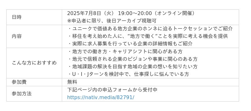 一方、FLNが2025年4月より運営を引き継いだ『Nativ.media』の編集部では、これまでに「地方移住"ホンネ"サロン」を通算24回に渡って開催し、地方移住を考える2,200人以上の方々からご好評をいただいておりました。これまでの参加者からは、より具体的に移住を考えるようになった反面、地方で魅力のある仕事を探すのはなかなか難しいという声も少なくありません。