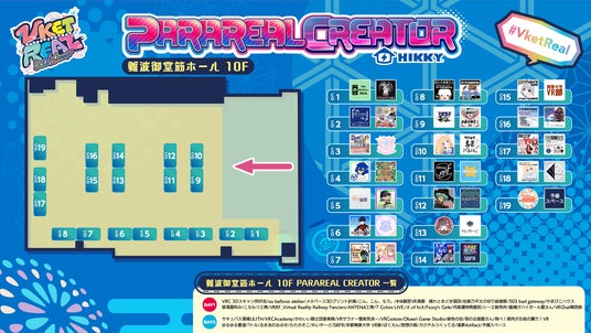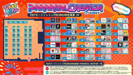 ■パラリアルクリエイターエリア詳細追加発表パラリアルクリエイターのブース配置図と出展サークルが確定しました。ブース数は「TKPガーデンシティPREMIUM秋葉原」で3日に32ブース、4日に34ブースが出展。「難波御堂筋ホール」には3日に19ブース、4日に18ブースが出展します。毎回多数の方が来場し盛り上がるパラリアルクリエイターエリアをお楽しみください。