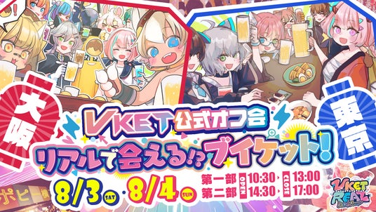 『Vket公式オフ会~リアルで会える!?ブイケット!~』は、2023年冬の前回開催時に、メタバースのユーザー等500名以上がリアル会場へ集結した人気イベントです。今回は規模を拡大し、東京・秋葉原の「スタジアムバー 秋葉リーグ」と「秋葉原アイドルステージ」、大阪・難波の「難波御堂筋ホール」の計3会場での開催が決定しました。