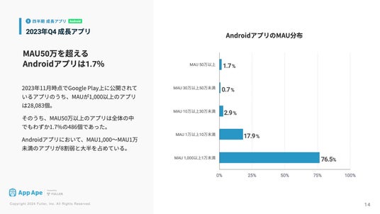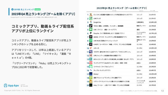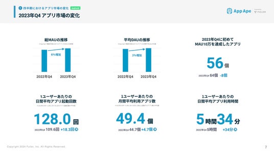 フラー株式会社(本社:新潟県新潟市、代表取締役:渋谷修太、山崎将司、以下「フラー」)は、アプリ分析サービス「App Ape(アップ・エイプ)」で蓄積するデータをもとに、アプリ市場の変化や急成長したアプリを調査した「四半期アプリ市場レポート2023年Q4編」を公開しました。