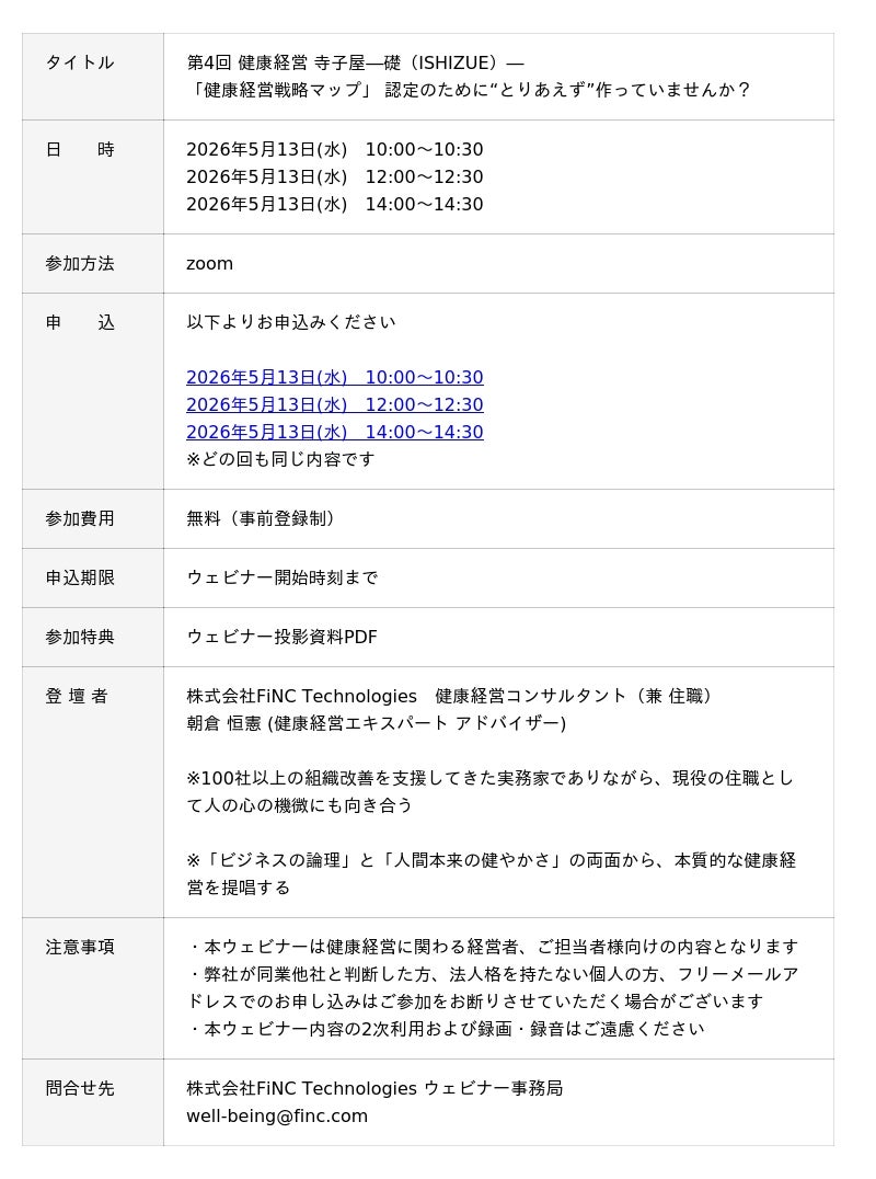 FiNC Technologies予防ヘルスケア×AI(機械学習、生成AI)に特化したヘルステックカンパニーの株式会社FiNC Technologies(本社:東京都千代田区、代表取締役社長:小島 かおり、以下「当社」)は、健康経営に関する無料ウェビナー「健康経営 寺子屋シリーズ 第4弾」を開催いたします。