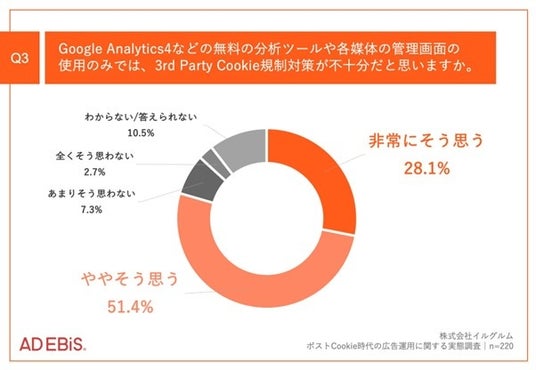 「Q3.Google Analytics 4などの無料の分析ツールや各媒体の管理画面の使用のみでは、3rd Party Cookie規制対策が不十分だと思いますか。」(n=220)と質問したところ、「非常にそう思う」が28.1%、「ややそう思う」が51.4%という回答となりました。