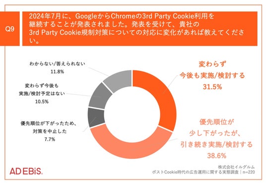 「Q9.2024年7月に、GoogleからChromeの3rd Party Cookie利用を継続することが発表されました。発表を受けて、貴社の3rd Party Cookie規制対策についての対応に変化があれば教えてください。」(n=220)と質問したところ、「変わらず今後も実施/検討する」が31.5%、「優先順位が少し下がったが、引き続き実施/検討する」が38.6%という回答となりました。