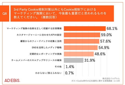 Q5(※1)で「実施している」「検討中で、今後実施する予定」と回答した方に、「Q8.3rd Party Cookie規制対策以外にもCookie規制下におけるマーケティング施策において、今後最も重要だと思われるものを教えてください。(複数回答)」(n=144)と質問したところ、「マーケティング施策の効果を正しく把握する計測環境」が68.1%、「カスタマージャーニーに合わせたKPIの設定」が59.0%、「顧客からのフィードバックの収集と活用」が57.6%という回答となりました。
