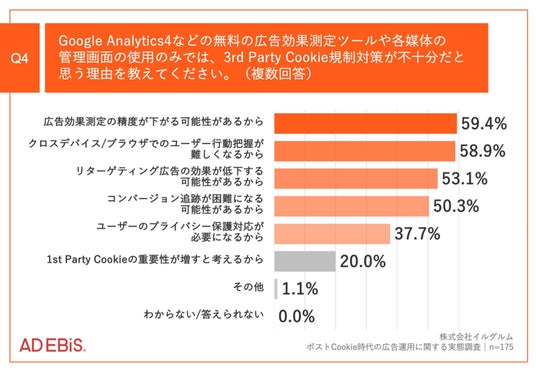 Q3で「非常にそう思う」「ややそう思う」と回答した方に、「Q4.Google Analytics 4などの無料の広告効果測定ツールや各媒体の管理画面の使用のみでは、3rd Party Cookie規制対策が不十分だと思う理由を教えてください。(複数回答)」(n=175)と質問したところ、「広告効果測定の精度が下がる可能性があるから」が59.4%、「クロスデバイス/ブラウザでのユーザー行動把握が難しくなるから」が58.9%、「リターゲティング広告の効果が低下する可能性があるから」が53.1%という回答となりました。