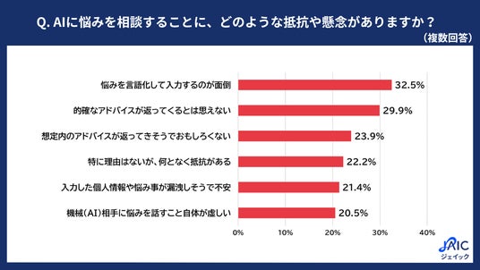■ AIに悩みを相談することへの抵抗や懸念:「悩みを言語化して入力するのが面倒」が最多冒頭の質問で、仕事やプライベートの悩みをAI(ChatGPT等)に、「相談したことはないが、今後してみたい」「相談したことはないし、今後もするつもりはない」と回答した方に、「AIに悩みを相談することに、どのような抵抗や懸念がありますか?あてはまるものをすべて選んでください」と質問したところ、「悩みを言語化して入力するのが面倒」が32.5%、「的確なアドバイスが返ってくるとは思えない」が29.9%、「想定内のアドバイスが返ってきそうでおもしろくない」が23.9%、「特に理由はないが、何となく抵抗がある」が22.2%、「入力した個人情報や悩み事が漏洩しそうで不安」が21.4%、「機械(AI)相手に悩みを話すこと自体が虚しい」が20.5%となりました。