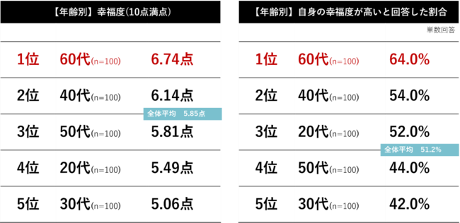 幸福度の平均は5.85点、また自分の幸福度が高いと感じる人は過半数(51.2%)でした。年齢別点数で見ると1位「60代」と2位「40代」に次ぐ、3位「50代」が平均以下で、「60代」と「40代」が平均を押し上げている結果に。