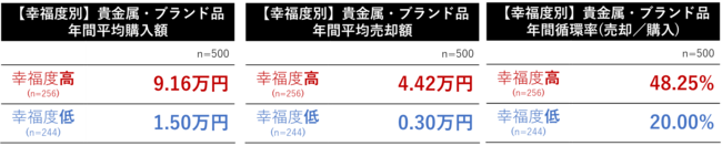 ブランド品リユースと幸福度の相関性を調べるために、「貴金属・ブランド品の購入/貴金属・ブランド品の売却」の結果を、「幸福度が高い」と感じる群(n=256)と「幸福度が低い」と感じる群(n=244)に分けて見ると、幸福度が高い人のほうが低い人よりも28%以上循環率が高い結果となりました。