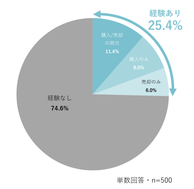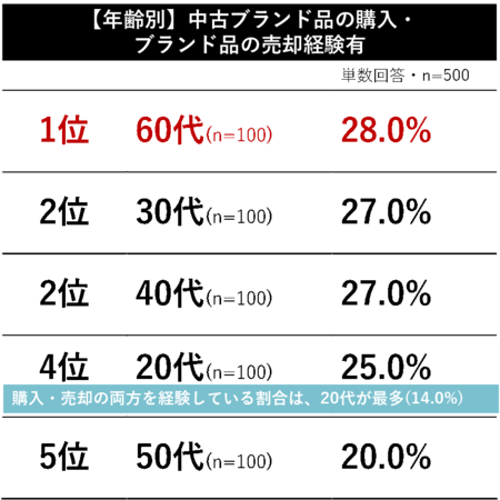 ブランド品リユース経験者はおよそ4人に1人ということが分かりました。年代別に見ると、1位は60代、2位は30代と40代が同率で、20代は4位でした。フリマアプリの利用イメージのある20代は、購入・売却の両方を経験している割合は全年代最多でしたが、全体としてはまだ伸びしろがありそうです。