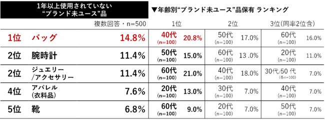 【5】1年以上使用されていない“ブランド未ユース品“ 1位「バッグ」(14.8%) 2位「腕時計」「ジュエリー/アクセサリー」(ともに11.4%)