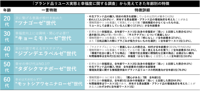 幸福度はワースト2位、ブランド品リユースの経験者は全年齢の中で最も少ない結果に。ただ、調査の中で環境負荷量に関する情報提供を行った所、全年代の中で最もブランド品リユースの利用意向が高く、50代の全年齢で1位となり、正しい知識を得ることで、ブランド品リユースの活用を進めていけそうな為“タダシクマナボーゼ”世代としております。