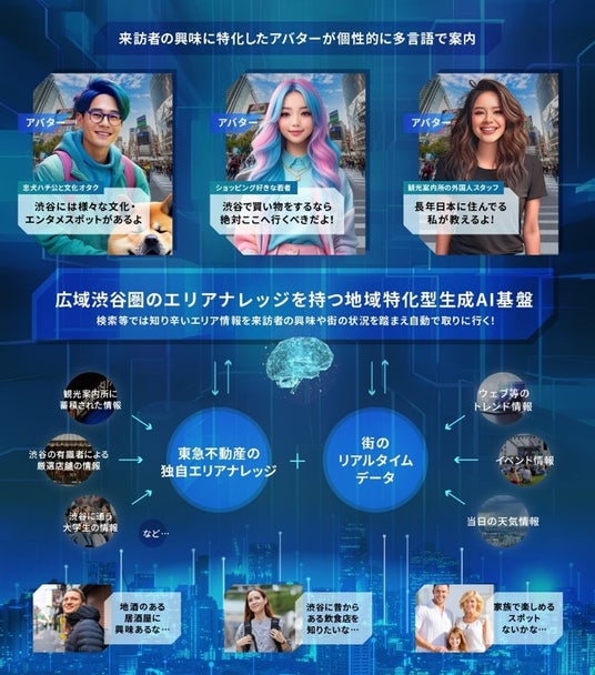 東急不動産株式会社(本社:東京都渋谷区、代表取締役社長:星野 浩明、以下「東急不動産」)とソフトバンク株式会社(本社:東京都港区、代表取締役 社長執行役員 兼 CEO:宮川 潤一、以下「ソフトバンク」)は、自然言語処理モデル「GPT」をベースに「広域渋谷圏」※1に特化した生成AI(人工知能、以下「地域特化型生成AI」)基盤を構築するとともに、データ連携基盤(都市OS)と組み合わせて、広域渋谷圏で収集したイベント情報や店舗情報、気象情報などの多様な情報を活用することで、来街者の行動変容を促す共同実証を2024年11月11日に開始します。