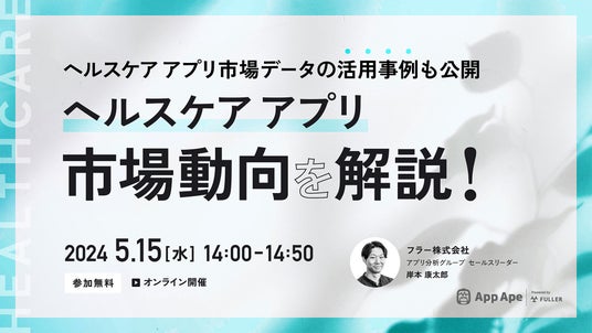 アプリ市場分析サービス「App Ape(アップ・エイプ)」を手がけるフラー株式会社(本社:新潟県新潟市、代表取締役:渋谷修太、山崎将司、以下「フラー」)は、「ヘルスケアアプリ市場動向解説セミナー」を2024年5月15日に開催します。本セミナーでは今後さらなる成長が期待されるヘルスケアアプリ市場に着目し、市場の動向をご紹介するとともに、ヘルスケアアプリ市場に関するデータの活用事例や活用シーンなどを徹底解説します。ヘルスケアアプリ市場動向をキャッチアップしたい方、新規事業や新しいアプリを企画・開発中の方など、ヘルスケアビジネスに関わる皆様が抱えている課題の解決に向けたヒントが得られる内容となっています。ぜひご参加ください。