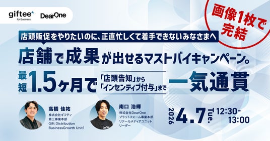 株式会社NTTドコモのマーケティング分野における新規事業型子会社である株式会社DearOne(本社:東京都港区、代表取締役:河野 恭久、以下:DearOne)が提供する、リテールメディアプラットフォーム「ARUTANA」は、eギフトプラットフォーム事業(※1)を展開する株式会社ギフティ(本社:東京都品川区、代表取締役:太田 睦、鈴木 達哉、以下:ギフティ)とともに、2026年4月7日(火)12時30分から無料ウェビナーを開催いたします。