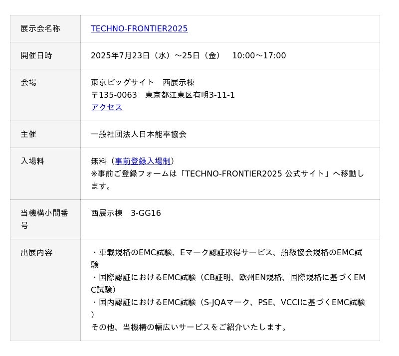 一般財団法人日本品質保証機構(本部:東京都千代田区、理事長:石井 裕晶)は、2025年7月23日(水)~25日(金)に東京ビッグサイトで開催されます「TECHNO-FRONTIER2025」に出展いたします。