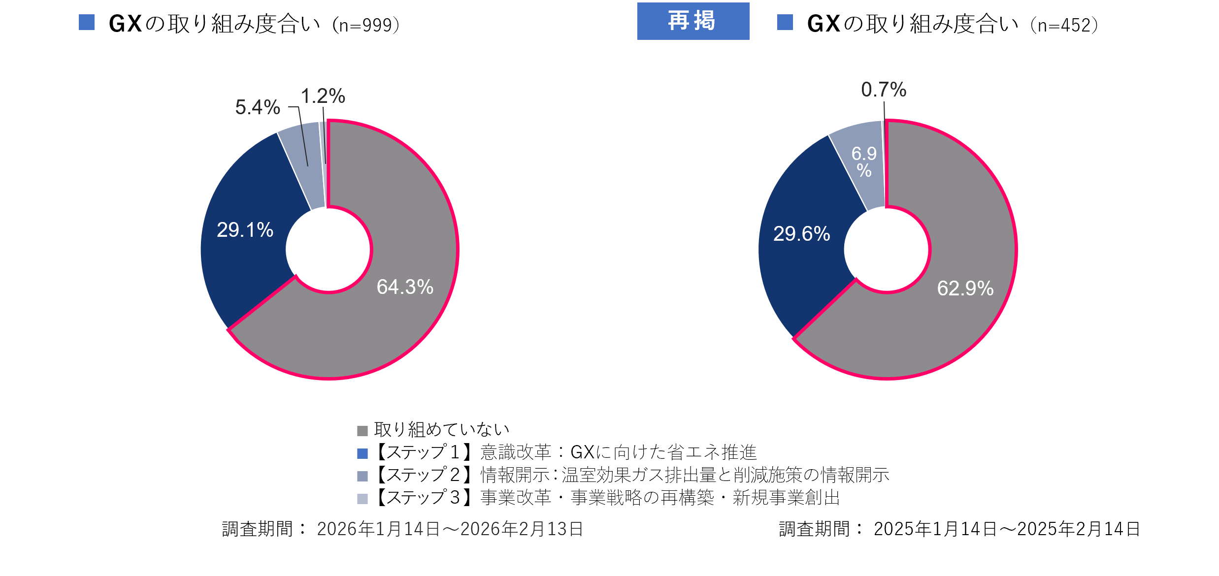 これらの結果から、「GXの認知度」と同様に、GXの取り組み状況もこの一年で変化はなく、【ステップ2】以上の取り組みを行う中小企業は1割にも満たないことが明らかになりました。
