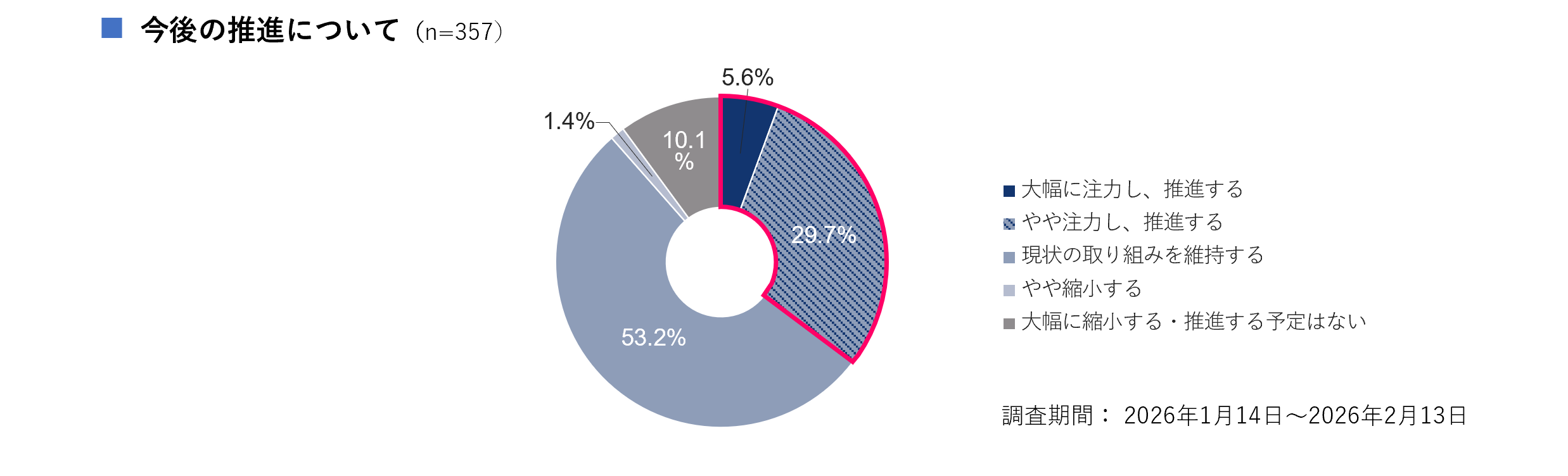 一方で、今後の推進意向については、GXへの取り組みステップが進んでいるほど今後の継続意向も高くなることが明らかになりました。