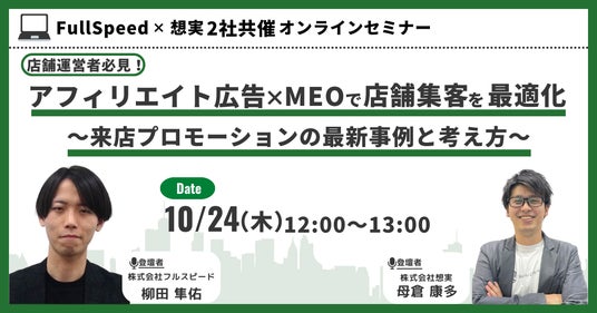 株式会社フルスピードと株式会社想実との共催で、店舗事業者様を対象に「店舗運営者必見!アフィリエイト広告×MEOで店舗集客を最適化~来店プロモーションの最新事例と考え方~」と題したオンラインセミナーを2024年10月24日(木)12時より開催いたします。