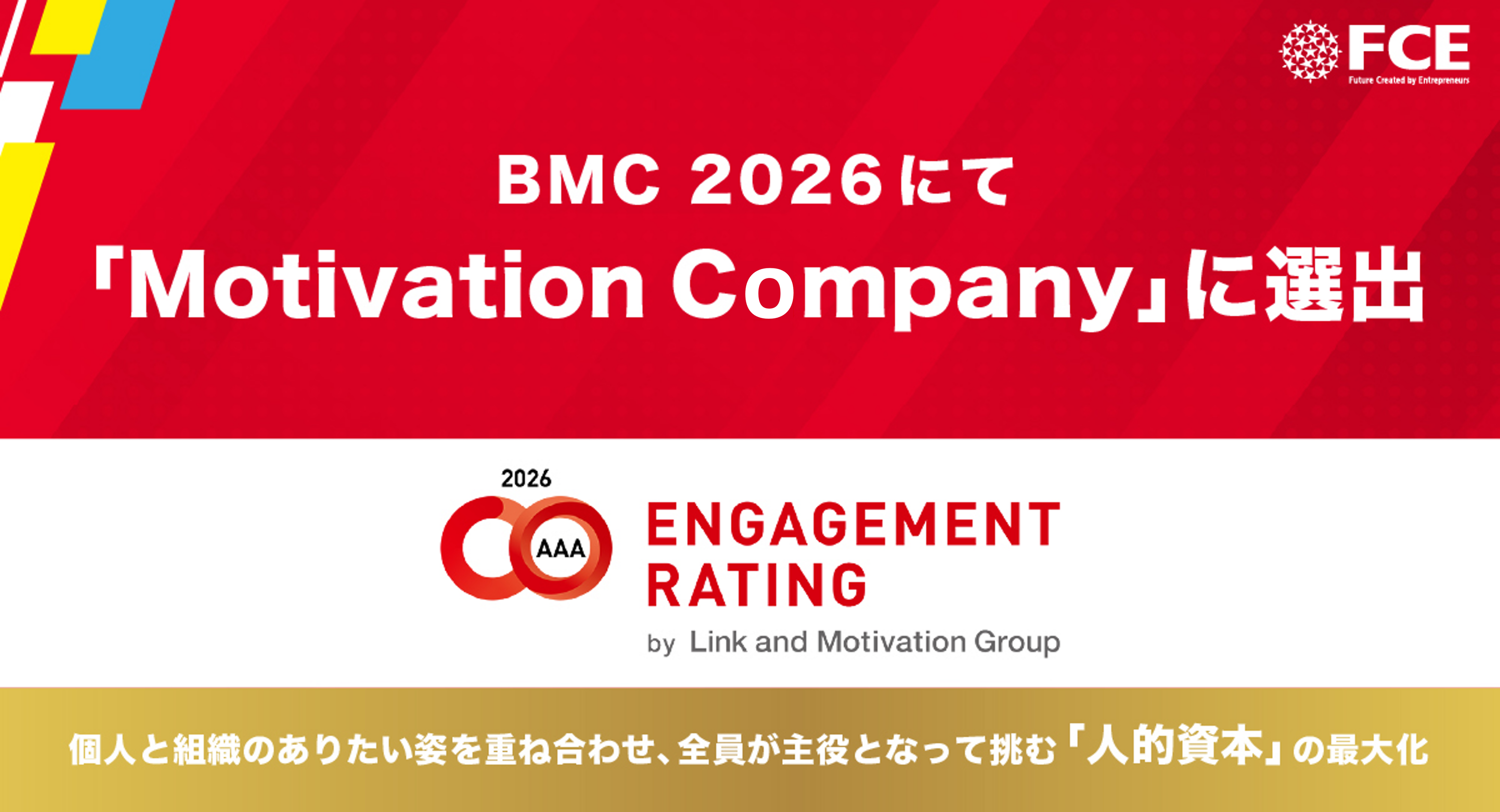 株式会社FCE(本社:東京都新宿区、代表取締役社長:石川淳悦、証券コード:9564)は、株式会社リンクアンドモチベーション(本社:東京都中央区、代表取締役会長:小笹 芳央、証券コード:2170、以下リンクアンドモチベーション)が発表した、「BMC2026」にて、従業員エンゲージメント(※1)が高い企業であるMotivation Companyに選出されました。