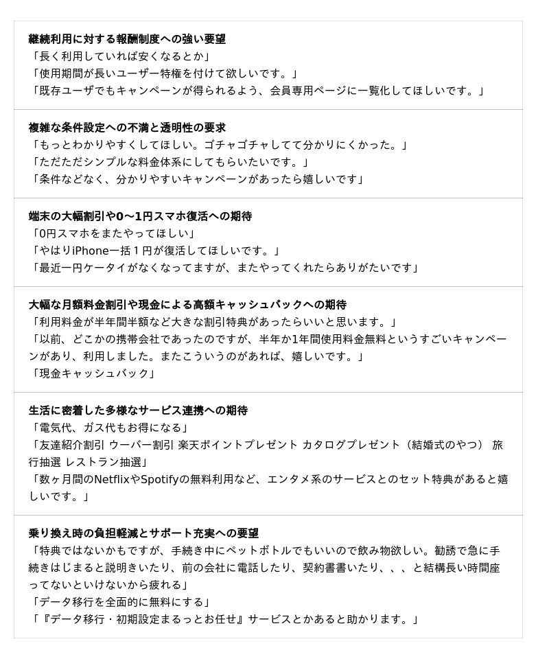 また、「条件をシンプルにしてほしい」「わかりやすいキャンペーンを」という意見も目立ち、複雑な適用条件への不満が根深いことが確認できます。