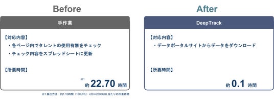 DeepTrack」の利用有無でどれほど効率化できるのか比較検証を実施したところ、作業時間を1/50以下に削減することが実証されましたので、その内容を公開いたします。