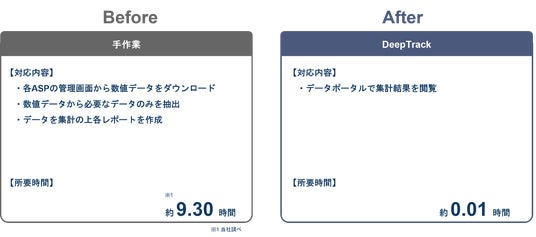 - 対象ASP4社において3種類の数値レポートを作成するのに要した時間は、各ASPからデータをダウンロードし手作業で行った場合は9.3時間、DeepTrackを利用した場合は0.01時間でした。