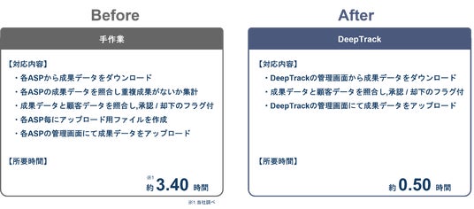 - 対象ASP4社における重複成果の除外および成果承認作業に要した時間は、データの目視やExcelシートで照合した場合は3.4時間、DeepTrack利用(一部:Excelでの照合が発生)の場合は0.5時間でした。