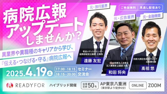 2025年4月19日(土)にイベント「病院広報アップデートしませんか?-異業界や異職種のキャリアから学び、『伝える・つなげる・守る』病院広報へ-」を開催いたします。なお本イベントは、