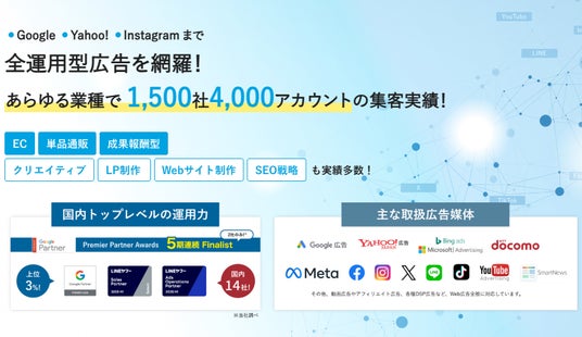 Googleが主催する「Premier Partner Awards」では、5期連続の国内ファイナリストに選出されており(※1)、また、LINEヤフー Partner ProgramのSales Partnerでは、優れた実績を持つ代理店だけに付与される特別な認定を受けています(※2)。