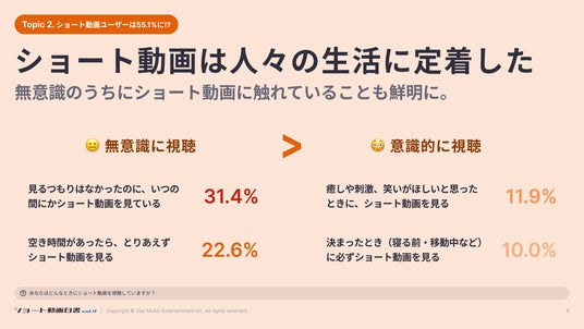 ショート動画は目的を持って視聴するユーザーよりも、特に目的なく無意識でショート動画を視聴しているユーザーが多いことも明らかになりました。