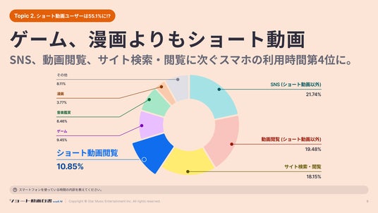 また今回の調査では、ショート動画視聴がスマートフォンの利用時間に占める割合が、SNS利用、動画コンテンツ視聴、サイト検索・閲覧に次ぐ結果でした。