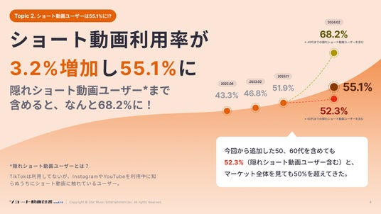 40代までのショート動画の利用率は前回調査時から3.2ポイント伸び55.1%と、ショート動画はさらに消費者へ浸透していることがわかりました。